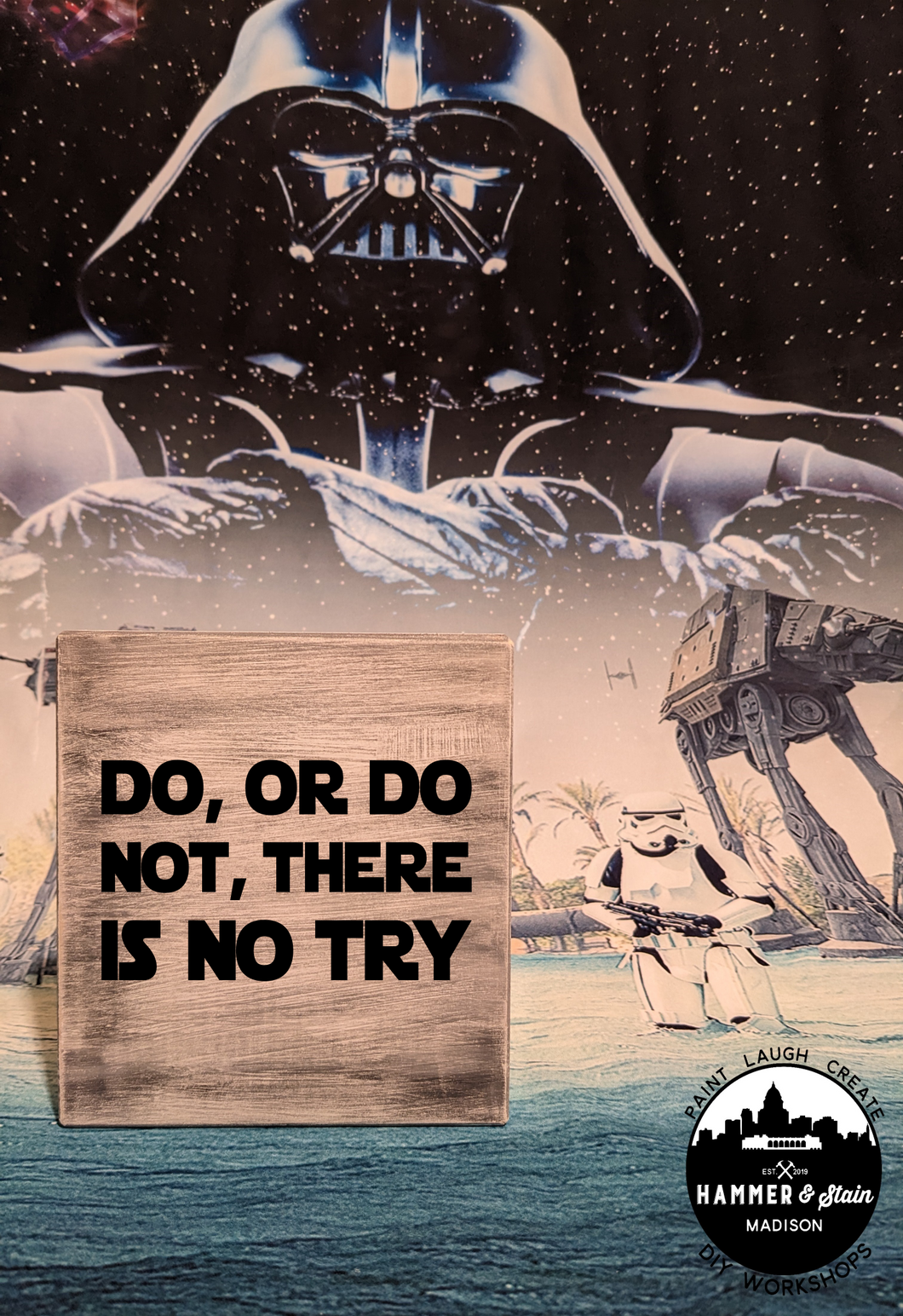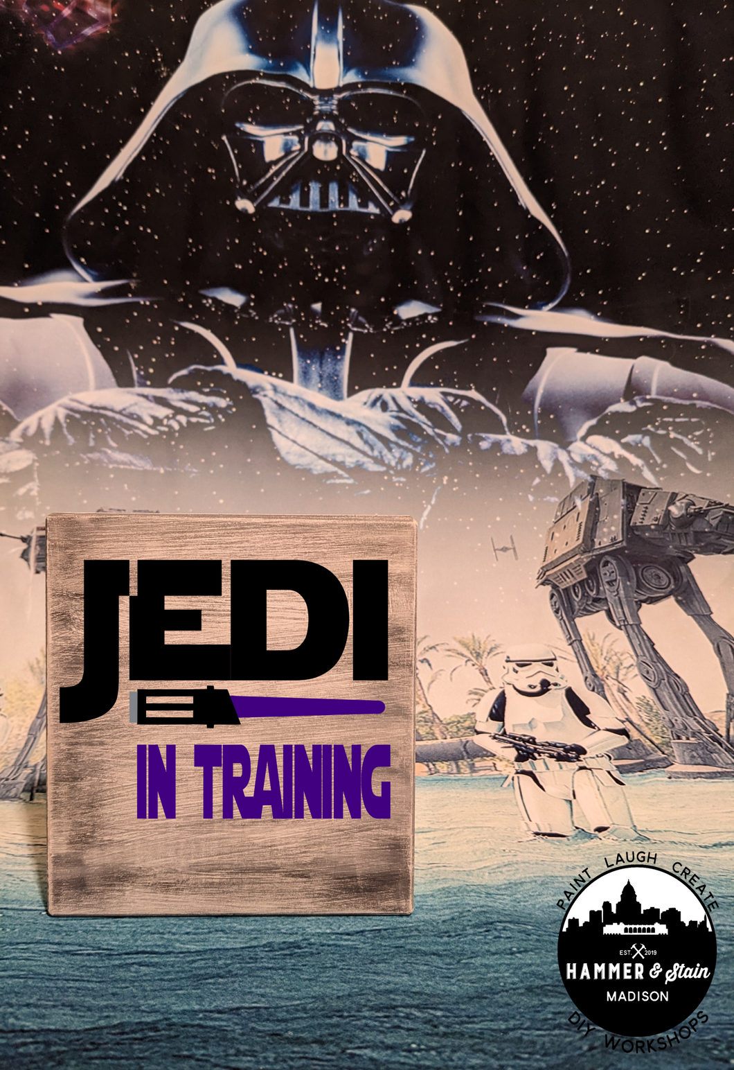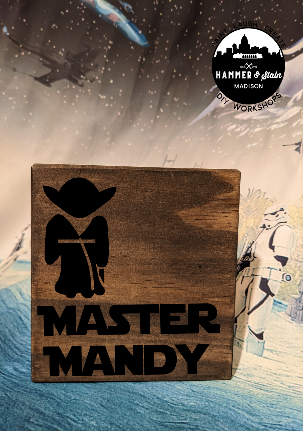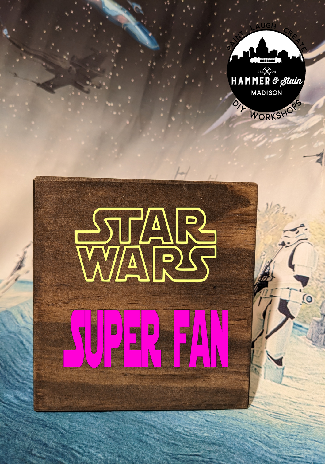 Where's all my Star Wars Fans? The Force is pulling you into Hammer & Stain to create a masterpiece. You will customize your project in studio with your choice of stains and paint colors. This registration allows for one adult to make one Sign. The class will be instructor lead.
