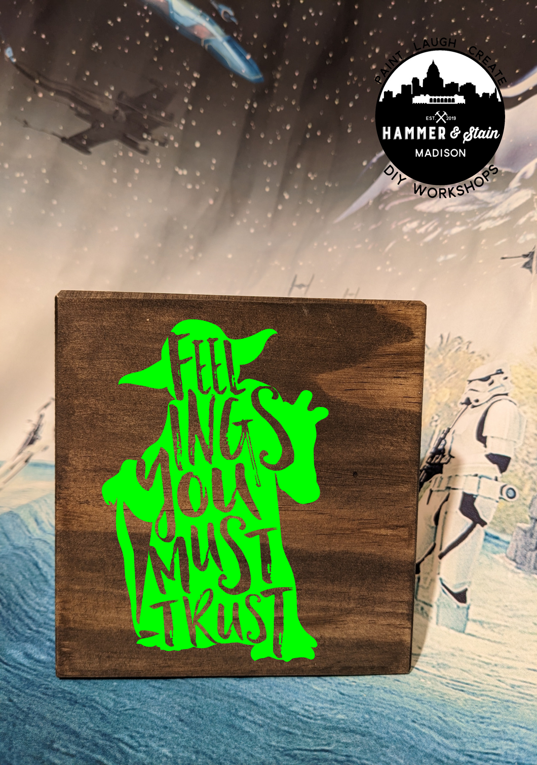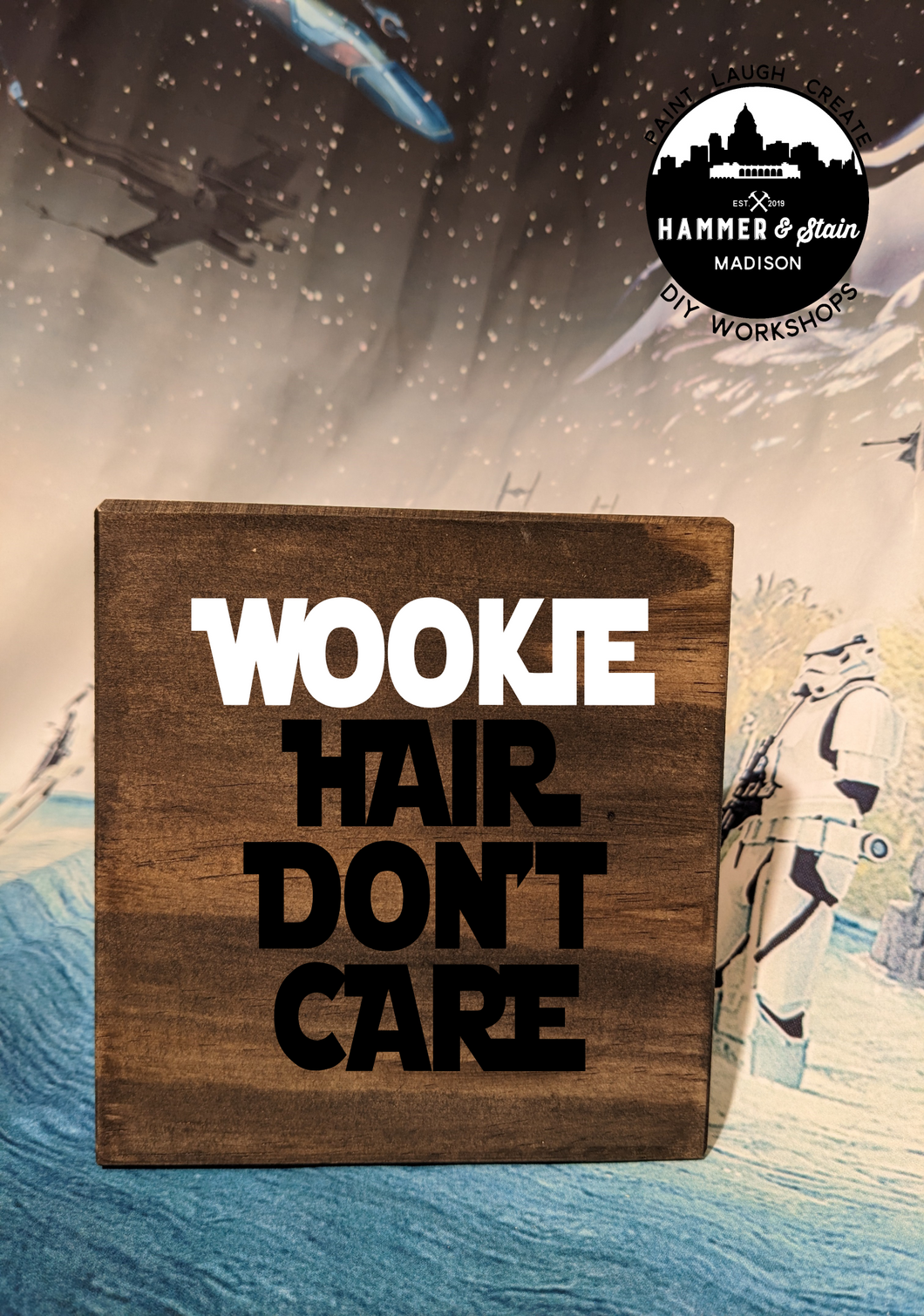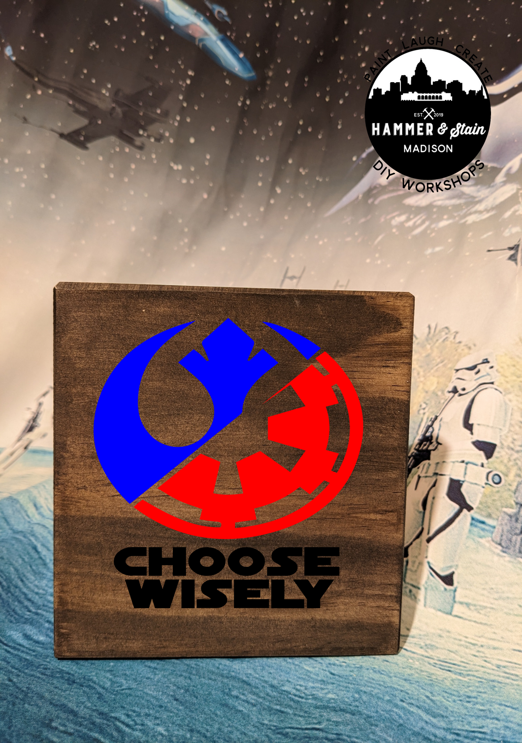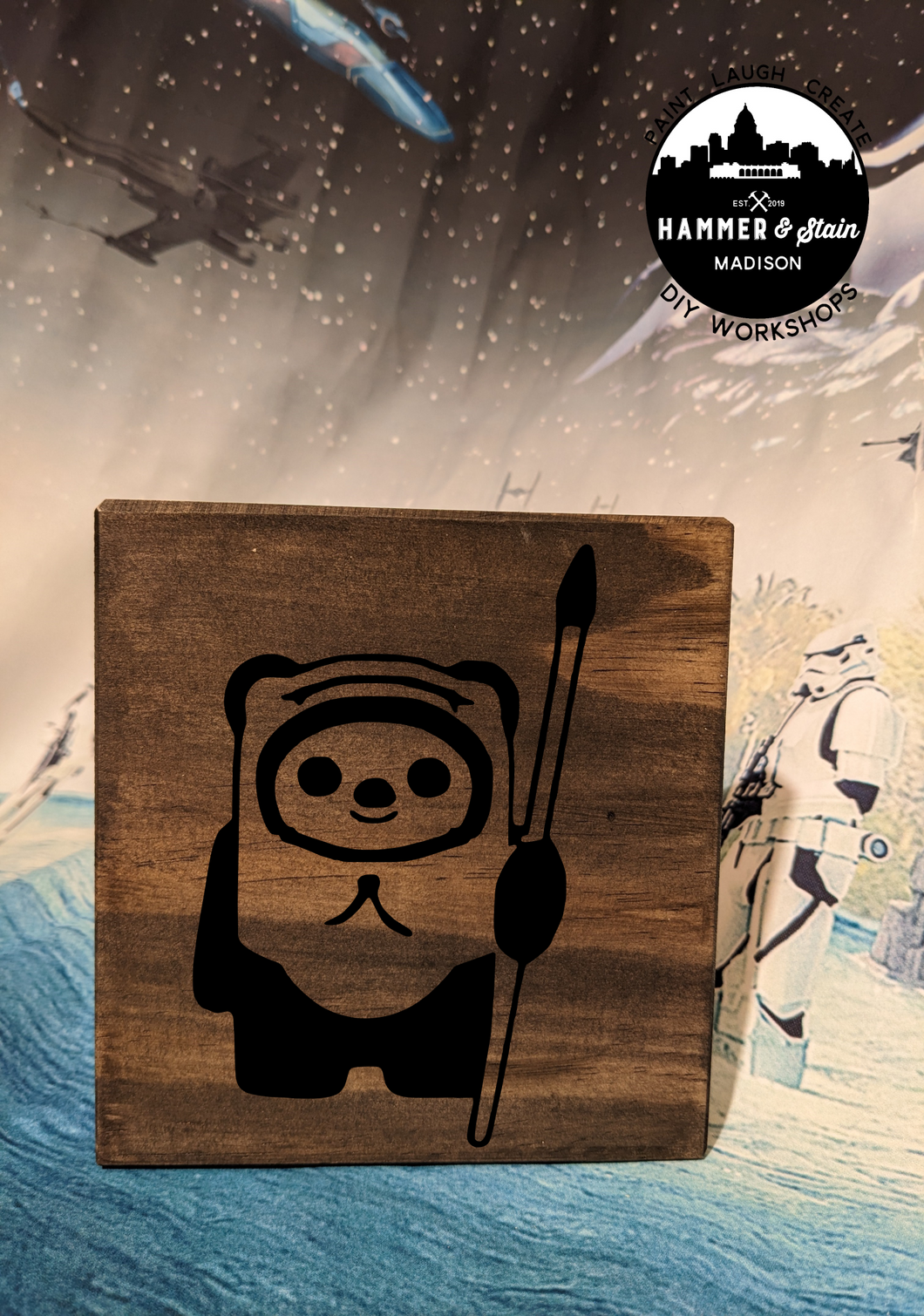 Where's all my Star Wars Fans? The Force is pulling you into Hammer & Stain to create a masterpiece. You will customize your project in studio with your choice of stains and paint colors. This registration allows for one adult to make one Sign. The class will be instructor lead.